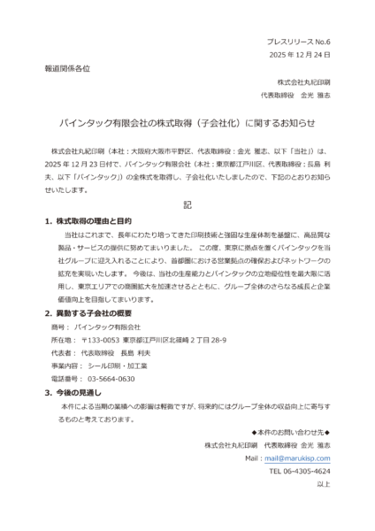 Maruki-News ホーム > お知らせ > パインタック有限会社の子会社化に関するお知らせ 2025年12月24日 お知らせ パインタック有限会社の子会社化に関するお知らせ ◁ 前へ お知らせ一覧に戻る ◁ 前へ お知らせ一覧に戻る Special Contents特設サイト お問い合わせContact ご相談・ご質問等ございましたら、お気軽にお問い合わせください。 06-4305-4624 月-金8:30~17:30 お問い合わせ